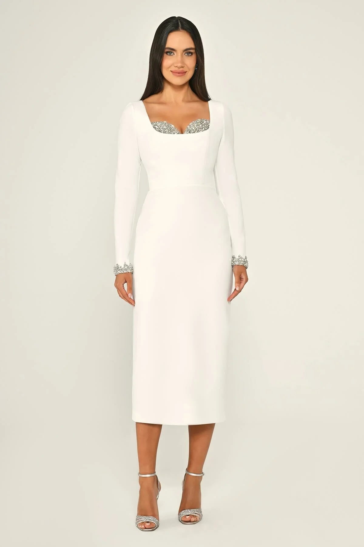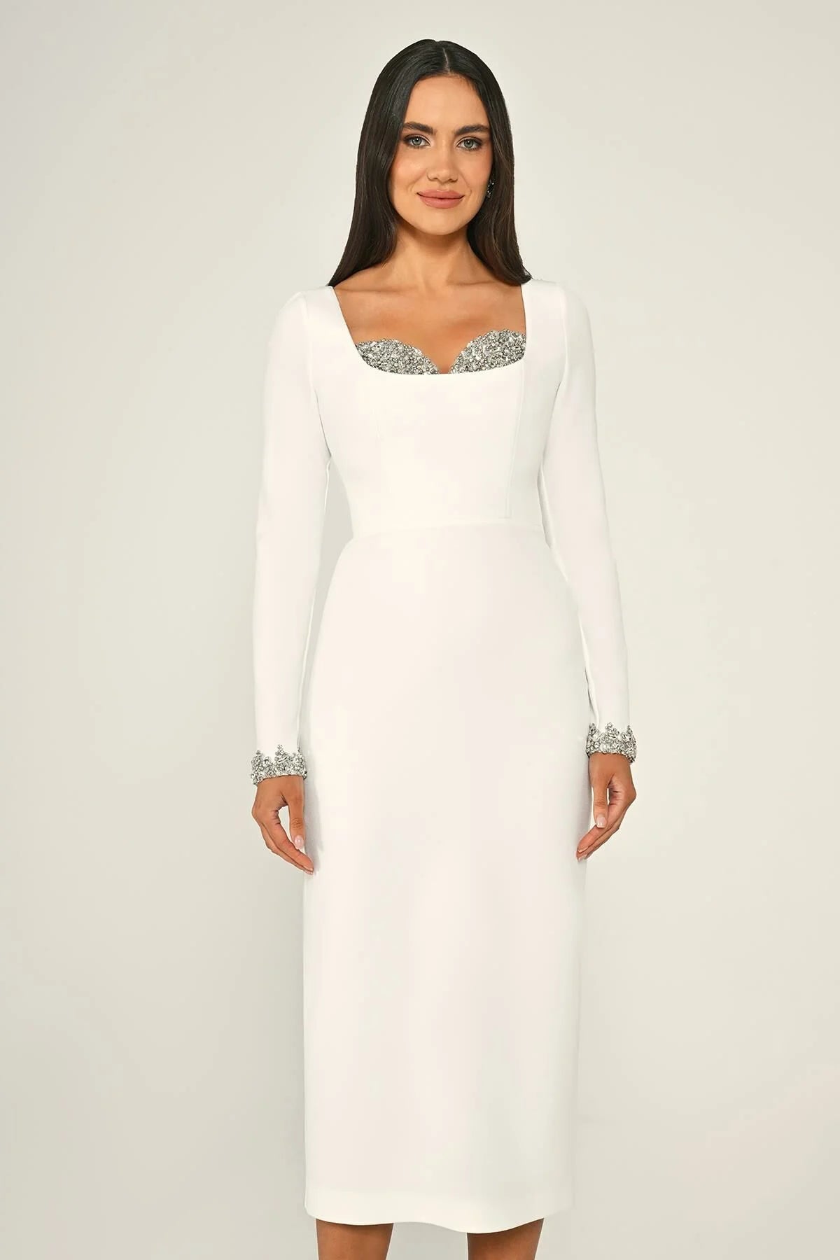This midi dress is crafted in sleek crepe, featuring long sleeves with jeweled cuffs, a square neckline with sparkling embellished bust detail, and a clean, elegant silhouette that balances modern chic with refined glamour.