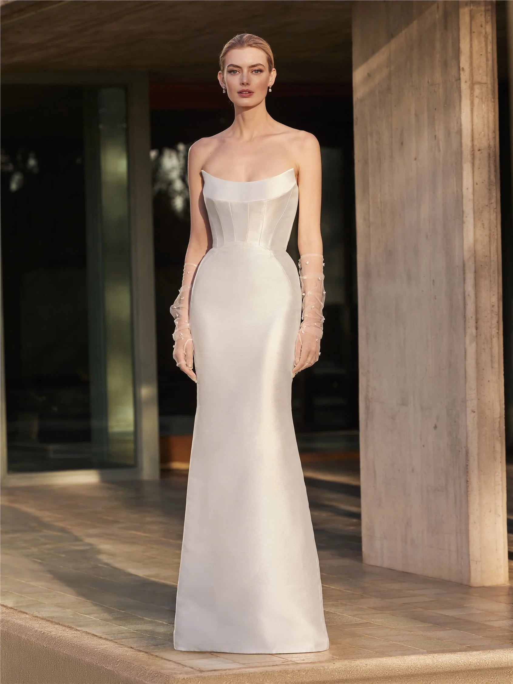 A strapless mermaid gown made from luxurious mikado fabric. Featuring clean, sculptural lines and a minimalist silhouette, it creates a modern yet timeless look. The dress includes a dramatic 140 cm train and is sleeveless with a fitted waist—ideal for a bride seeking elegance with sleek simplicity.