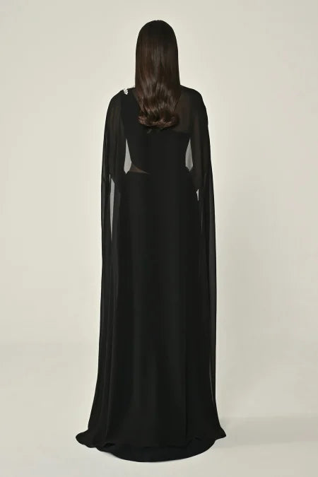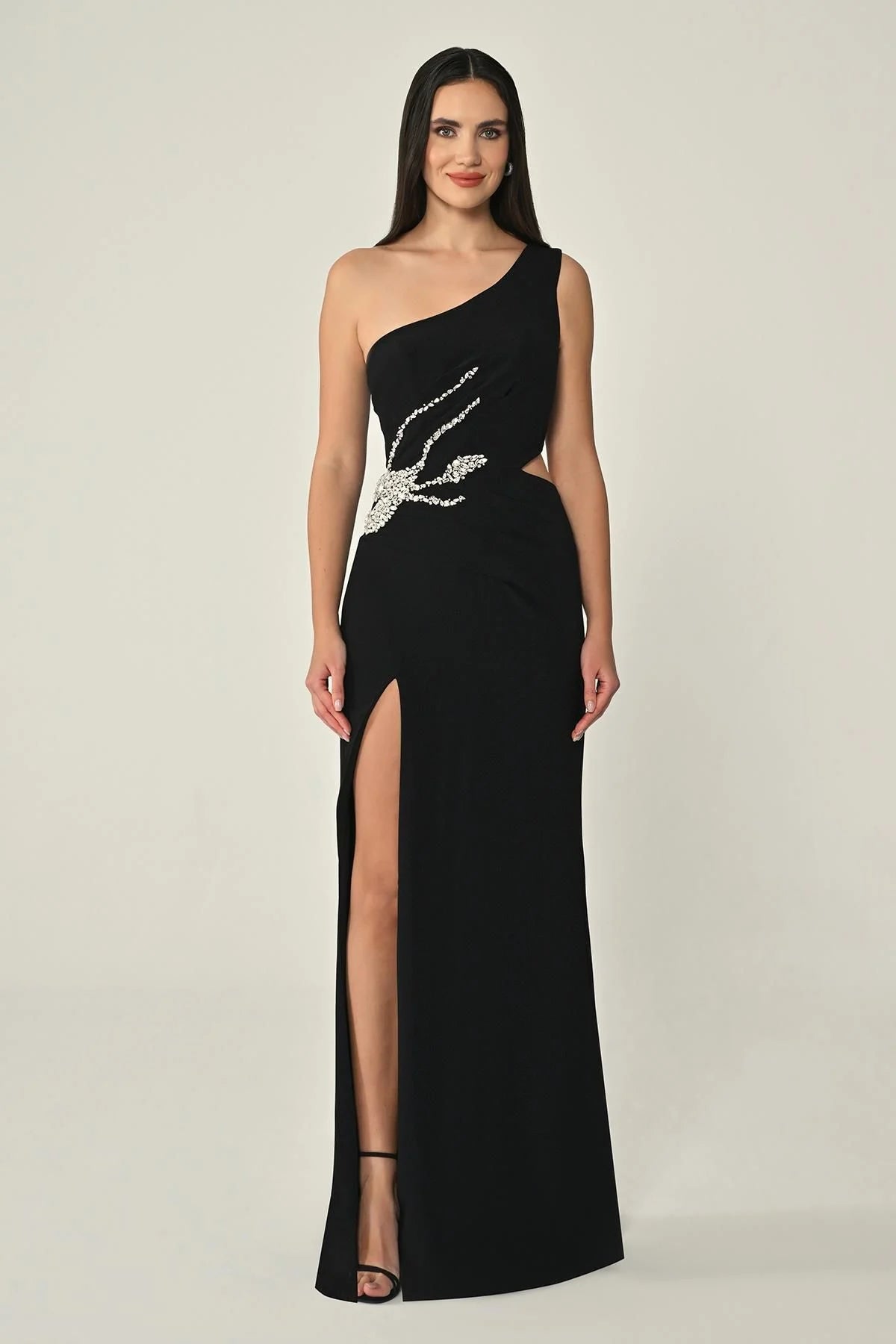 The Alfa Beta 6396 is a full-length evening gown crafted from non-stretch crepe fabric. It features a one-shoulder neckline, sleeveless design, and a column silhouette. The dress is adorned with crystal embellishments and includes a shawl. It has a closed back with an invisible center-back zipper.