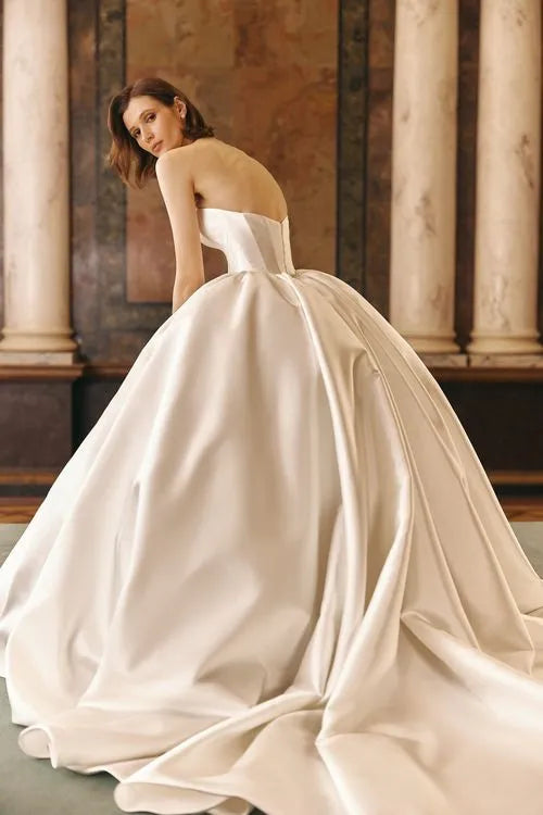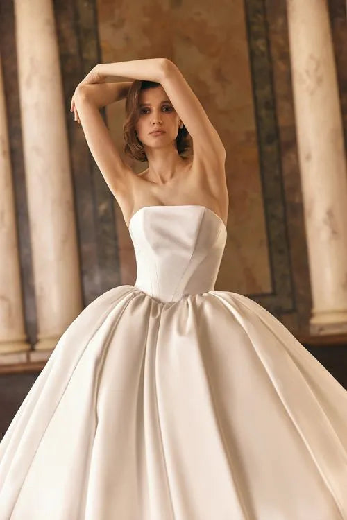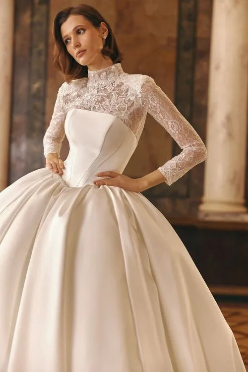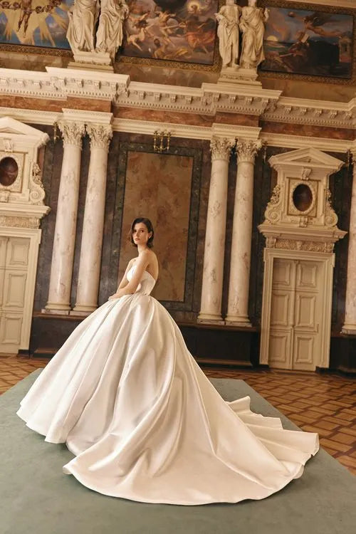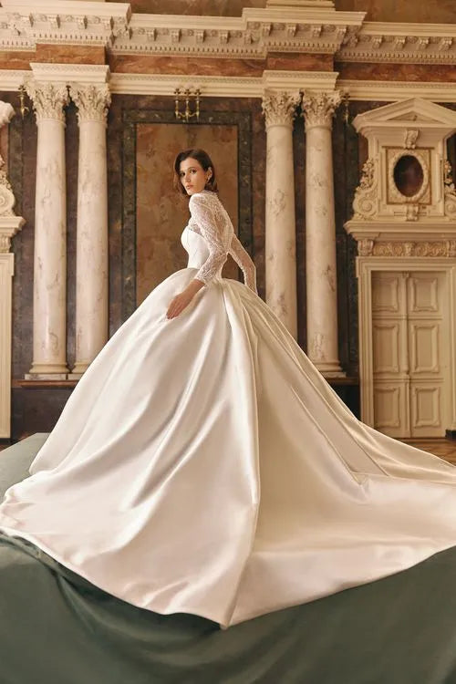 This magnificent ball gown, crafted from luxurious Mikado fabric, captivates with its structured silhouette and V-shaped waistline, accentuating the figure beautifully. The look is completed with a lace-embellished bolero with long sleeves, allowing the bride to transform her style effortlessly. Wear it for a regal, sophisticated charm or reveal the stunning open gown for a sleek, modern touch. Two looks in one, perfect for a bride who loves both timeless grace and contemporary allure.