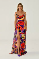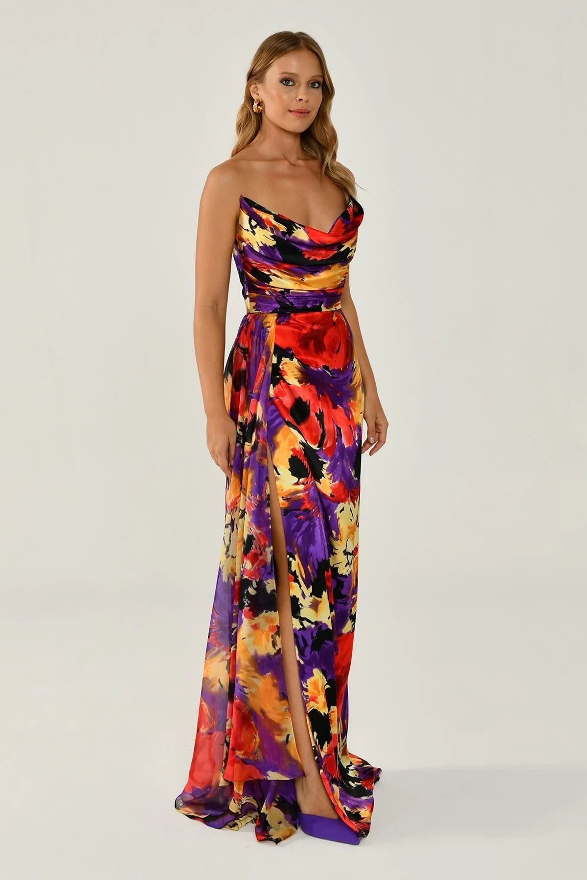 The Alfa Beta 6559 dress is a full-length sleeveless satin evening gown with a décolleté neckline, open back, natural waist, invisible center-back zipper, and a slit.