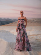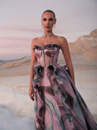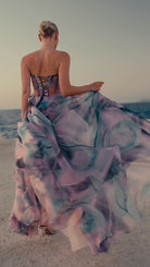 The Alfabeta 7166 is a strapless, floor-length evening gown made of shimmering organza with a fitted corset bodice and a voluminous A-line skirt. It features a sweetheart neckline, ruffled accents, and an elegant open-back design — perfect for formal events or galas.