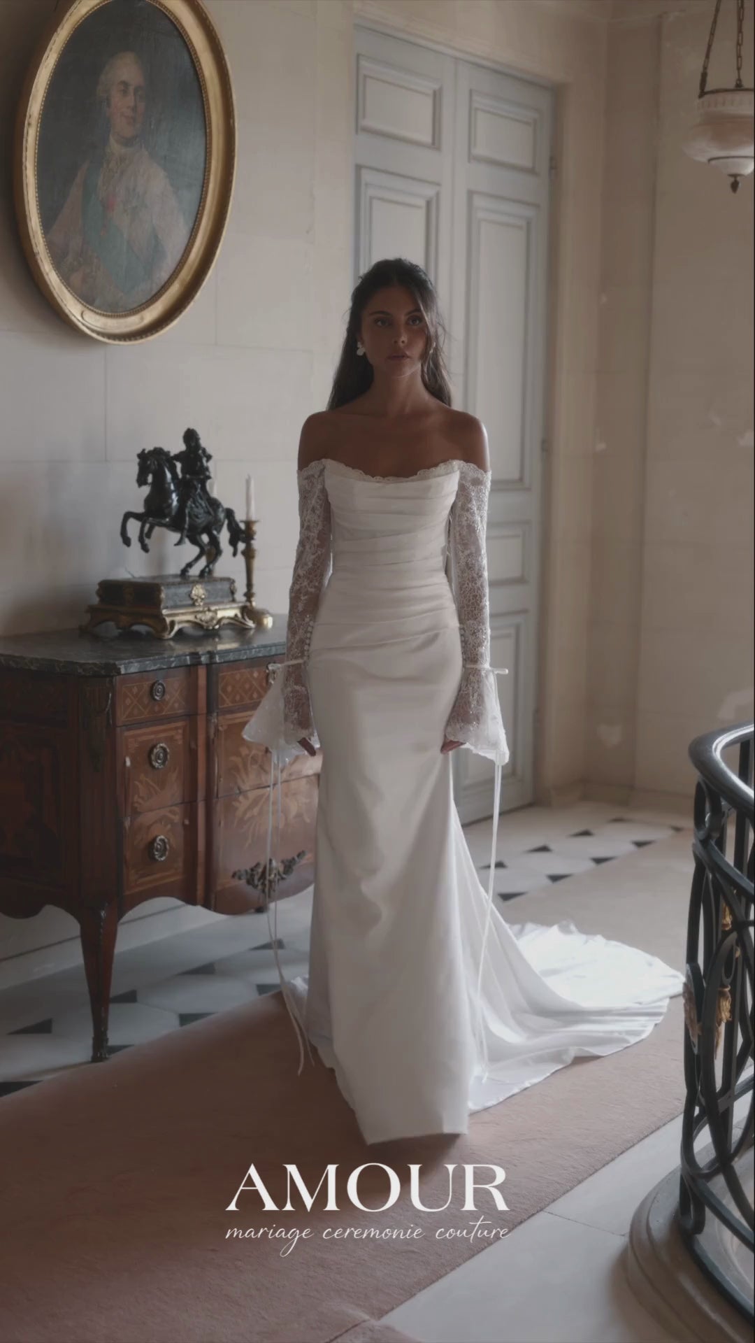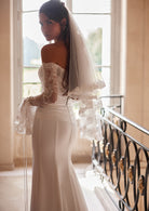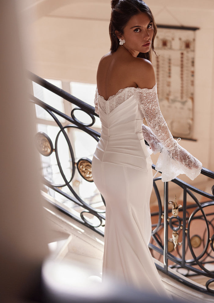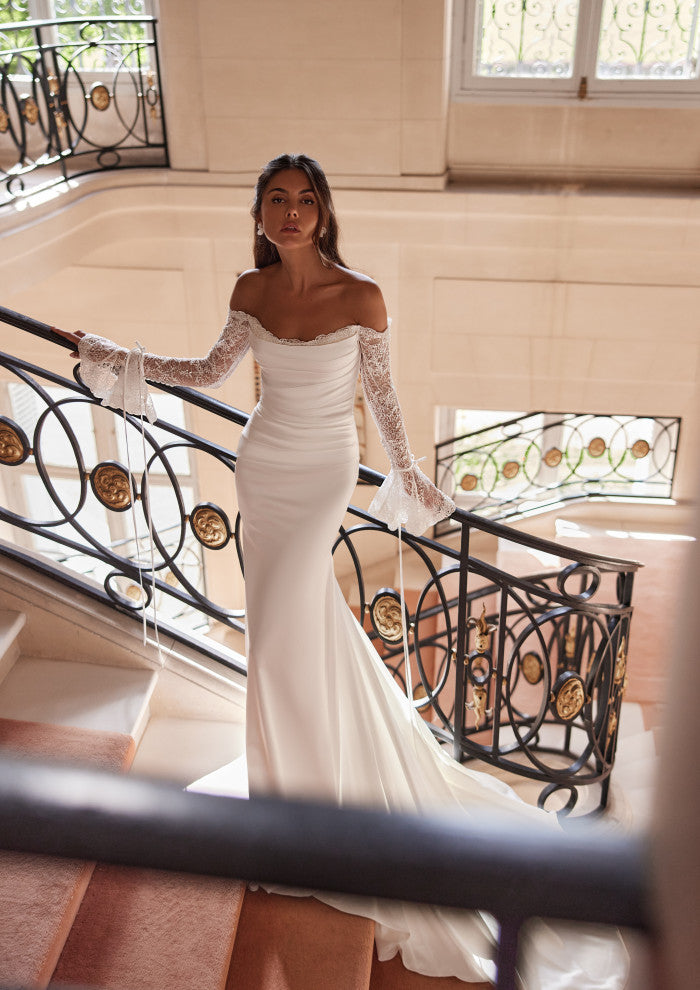 Elegance that takes your breath away. This mermaid gown enhances your silhouette with a timeless off-shoulder design and delicate lace sleeves for a touch of romance