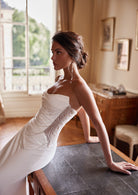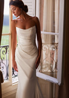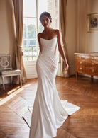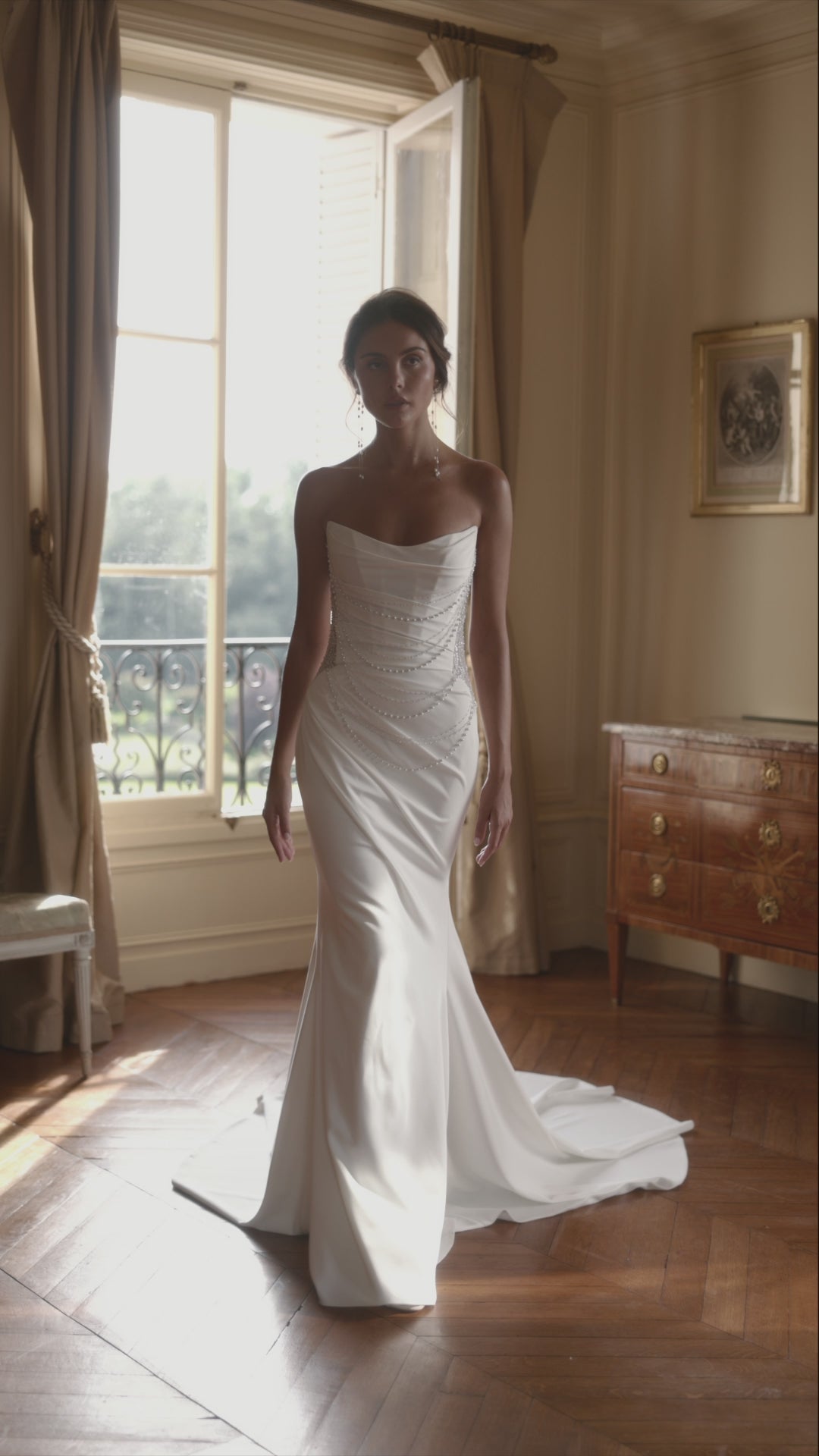 A mermaid-style gown with timeless elegance. The strapless corset bodice sculpts the figure, while silk stretch satin and lace fabrics bring delicate texture and movement. The dress features pearls and draped detailing for subtle embellishment, and the backless cut adds a romantic touch. Floor-length with a refined silhouette, this dress is perfect for brides seeking a blend of simplicity, vintage charm, and sophistication.