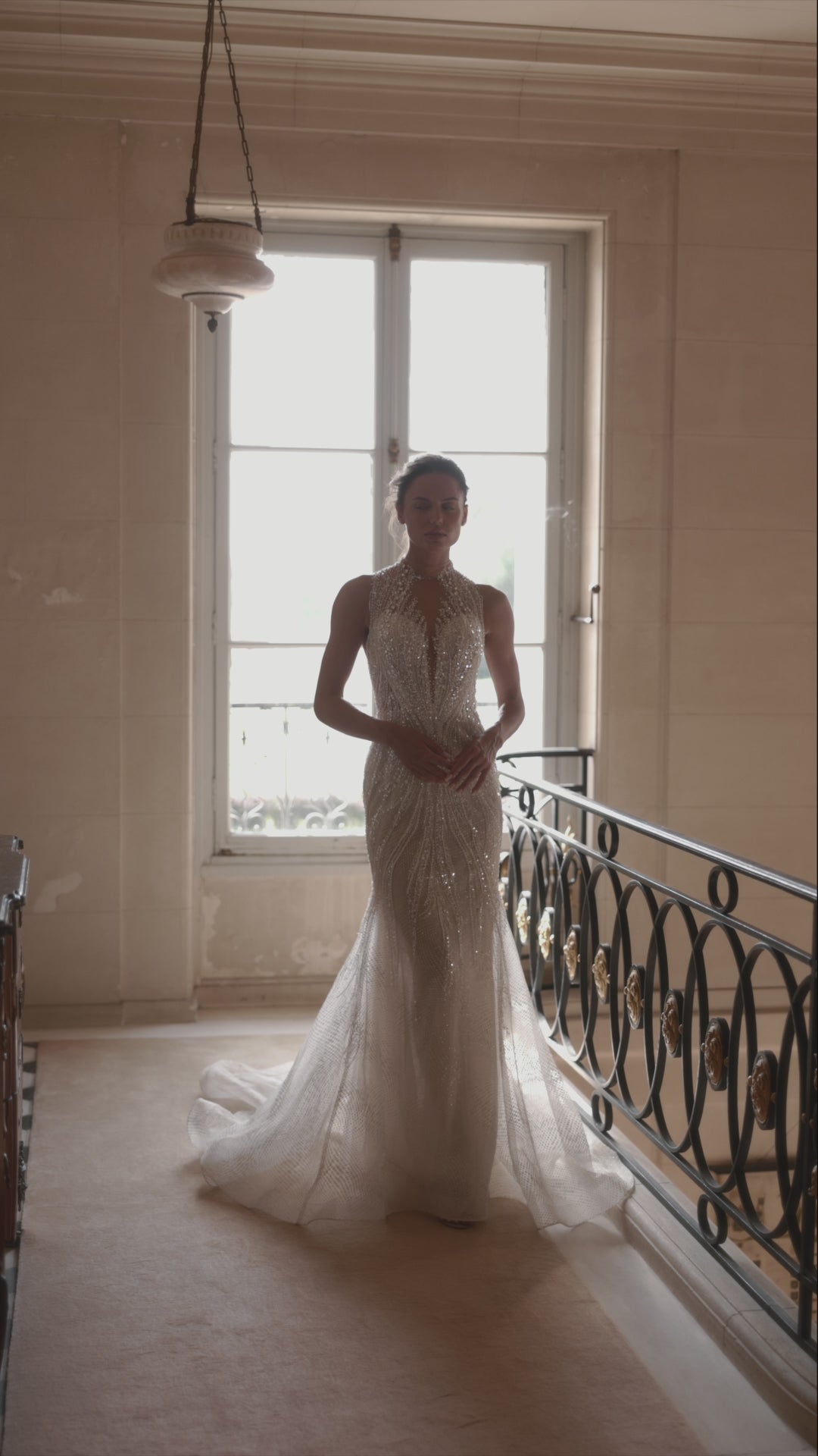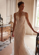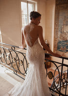 The Pandora gown from Yedyna's Inspired by Love collection is a captivating blend of sensuality and sophistication. Its high-neck halter design and backless feature create a striking silhouette, while the mermaid cut accentuates the figure. Crafted from lace and glittery fabric, the dress is adorned with intricate lace and beaded details, adding a touch of glamour. Available in both plus size and petite, Pandora offers a perfect fit for every bride.