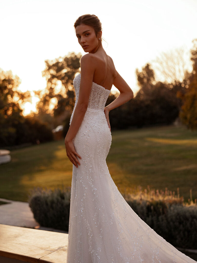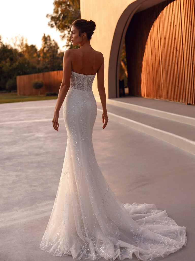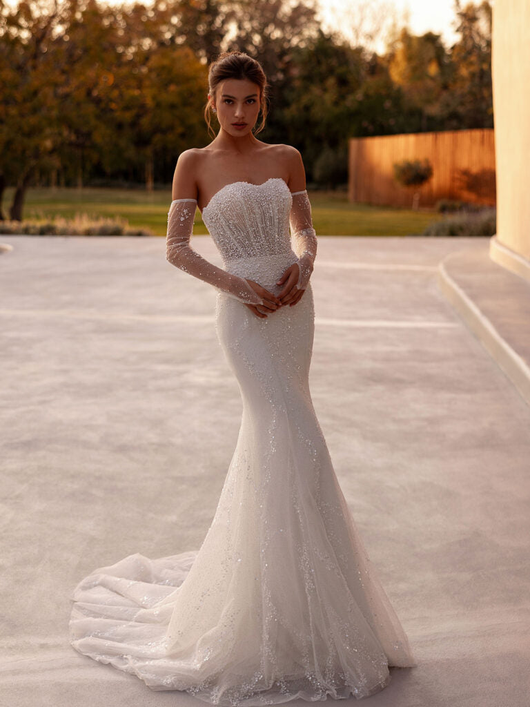 Contemporary glamour meets radiant enchantment in this fitted bridal gown. Crafted from beaded and sparkling tulle, the structured bodice and sleek silhouette create a striking shape. Pair it with the matching glove-like sleeves (SL109) for a bold and unforgettable finish.