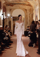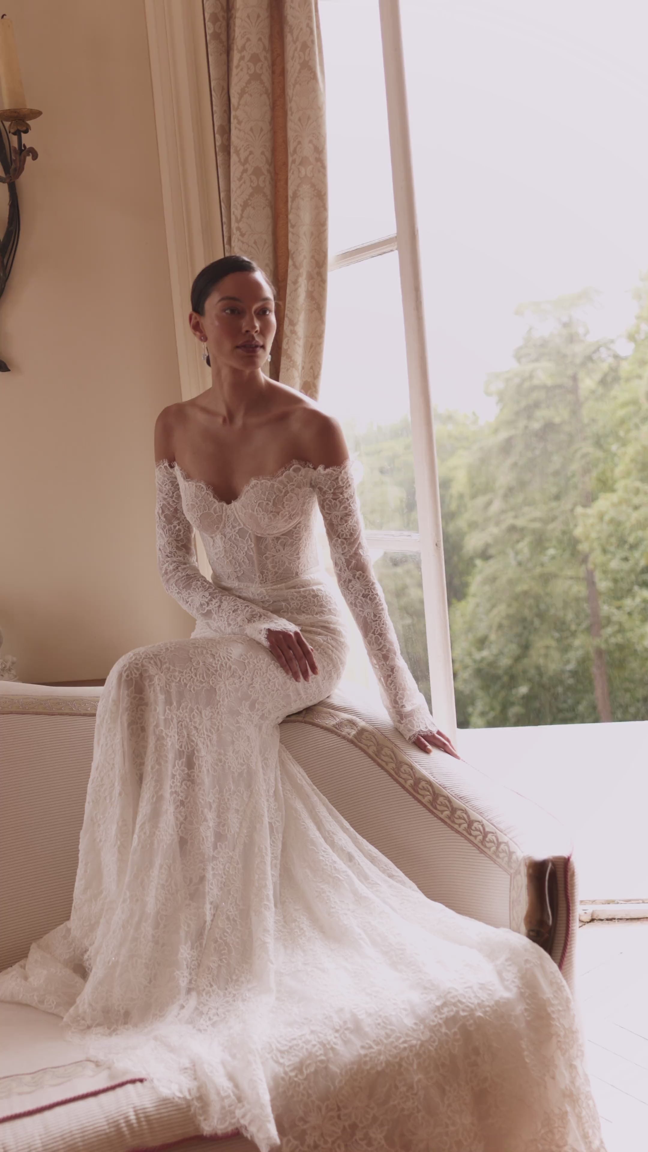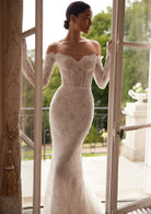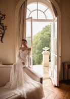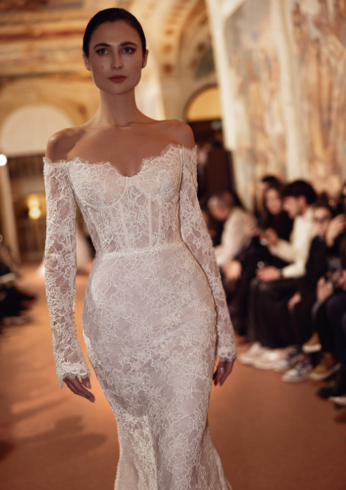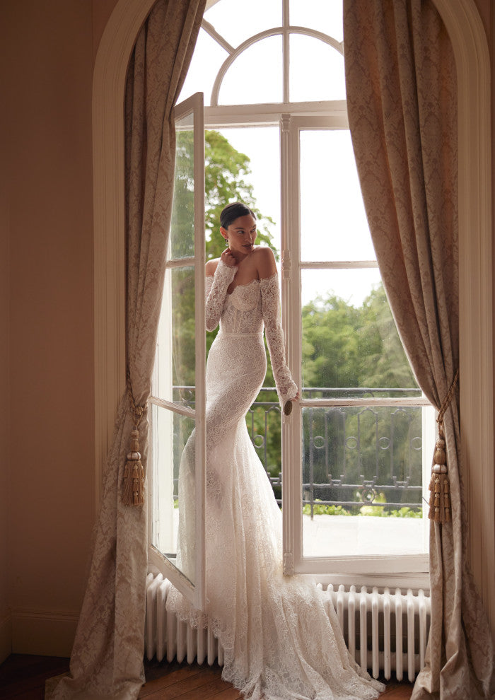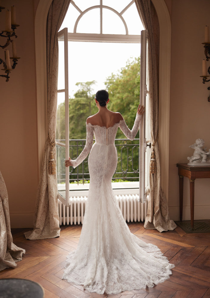 A mermaid silhouette wedding gown featuring a lace neckline and intricate decor detail. Elegant, figure-flattering, and perfect for a romantic “Inspired by Love” bride.