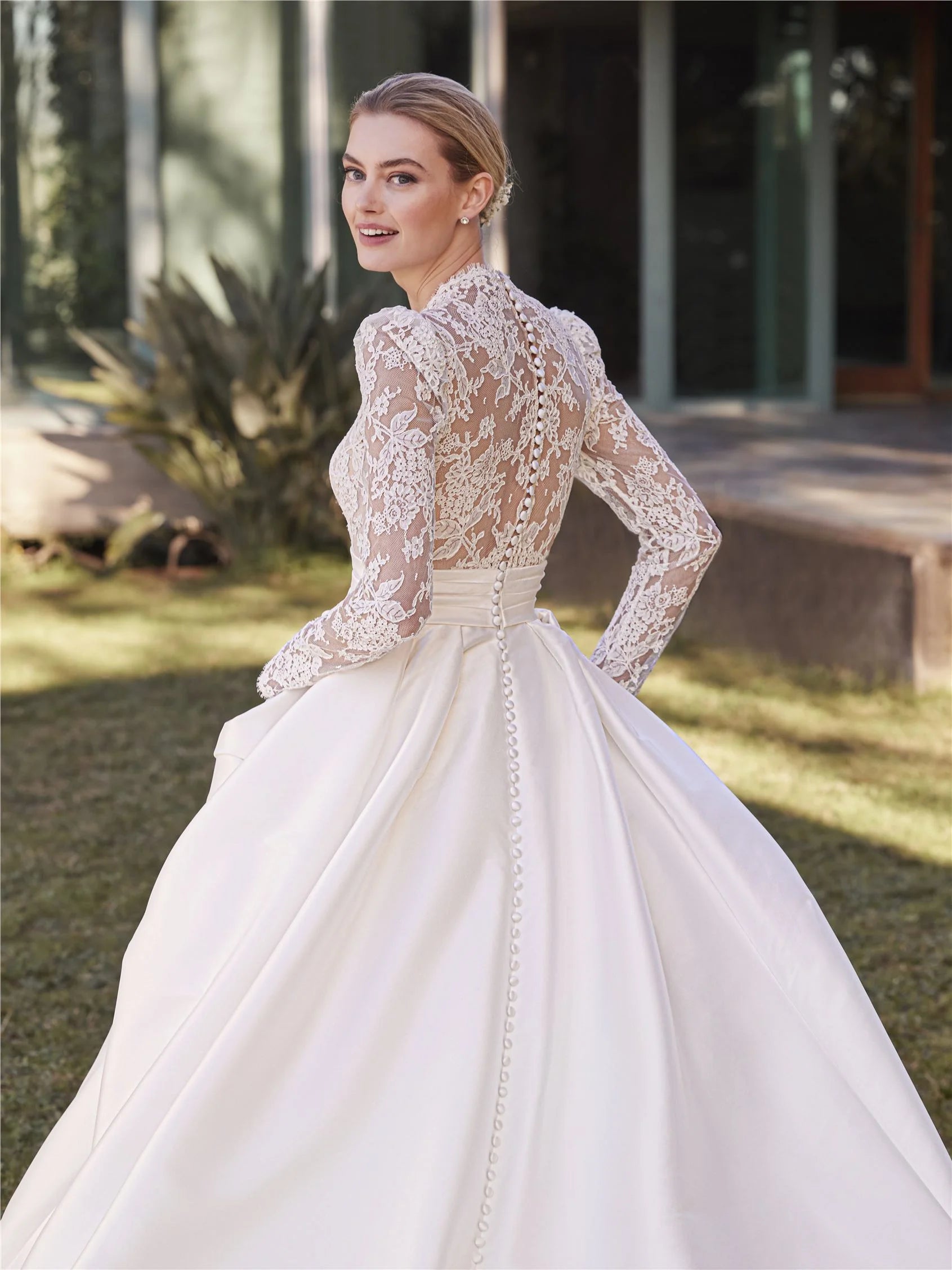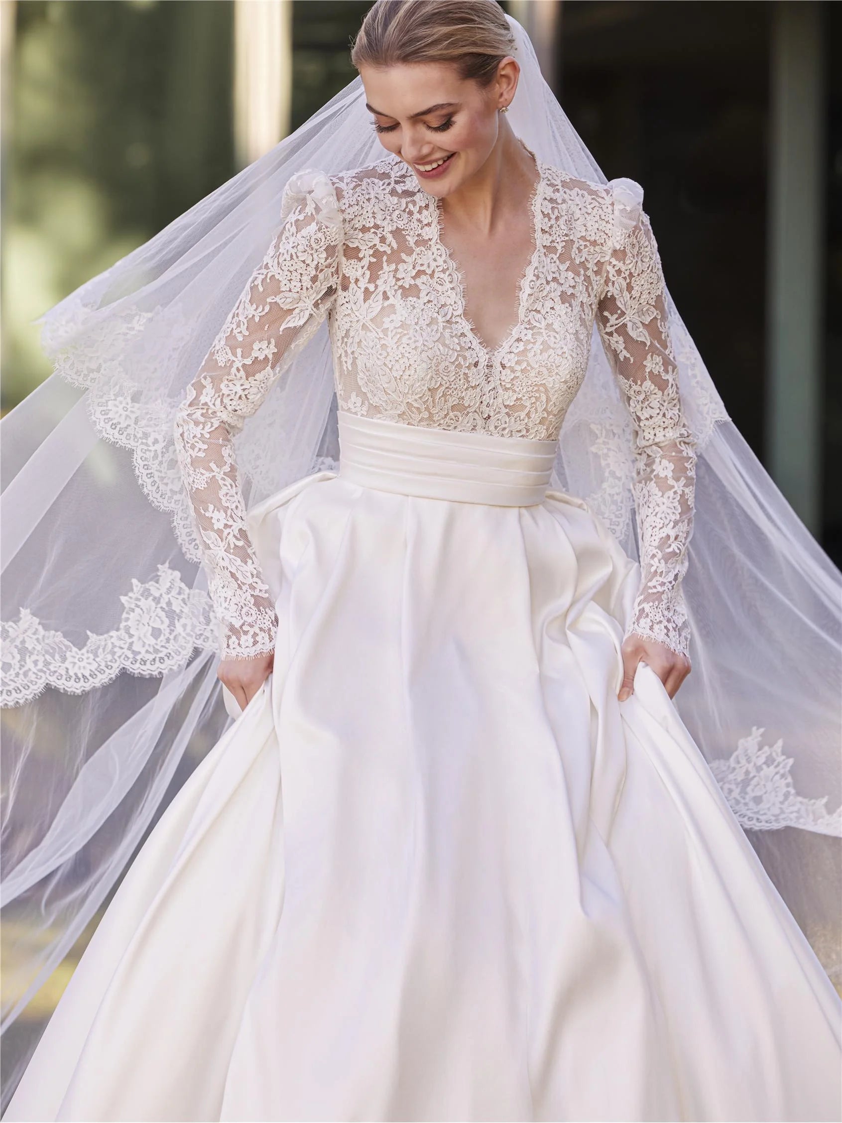 A majestic princess-style ball-gown that elegantly blends romance and drama. Crafted in luxurious Mikado fabric with corded Chantilly lace, it features a low V-neckline, long fitted sleeves, and a high waist that flows into a sweeping 180-cm train. Perfect for the bride who wants regal presence with classic fairy-tale beauty.