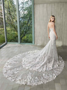 A mermaid silhouette dress with a sweetheart neckline, combining chantilly lace, beads, and embroidery. It offers a luxurious, lace-rich aesthetic packed with detail.