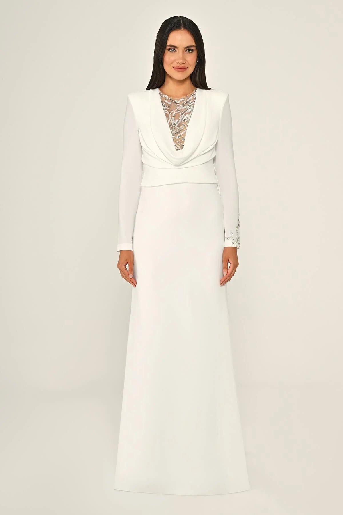 The Alfa Beta 7020 is a sleek long gown in crepe, featuring a draped cowl neckline layered over an embellished sheer bodice, long sleeves with delicate detailing, and a clean, floor-length silhouette.