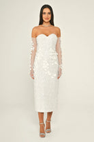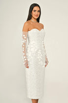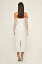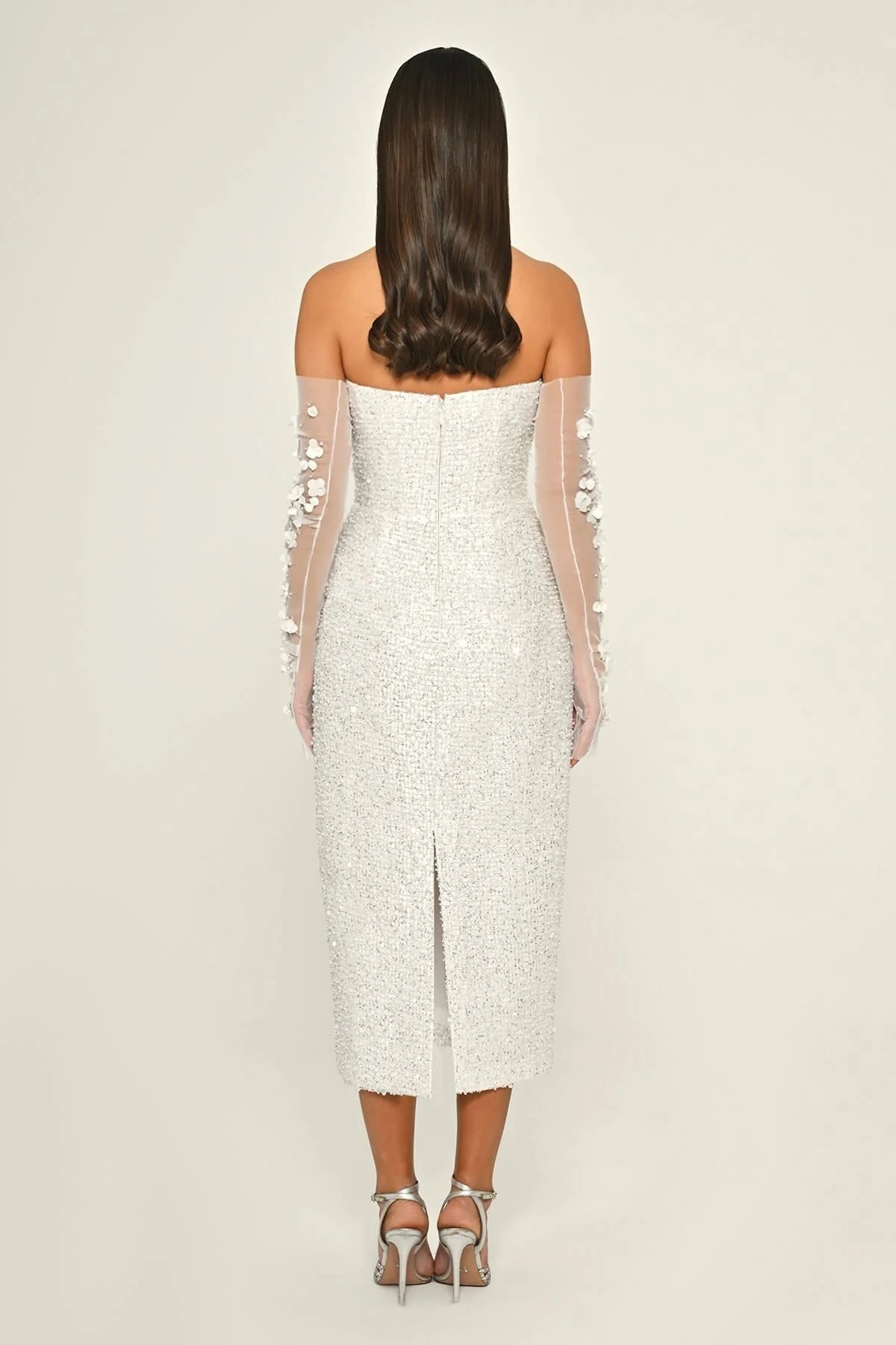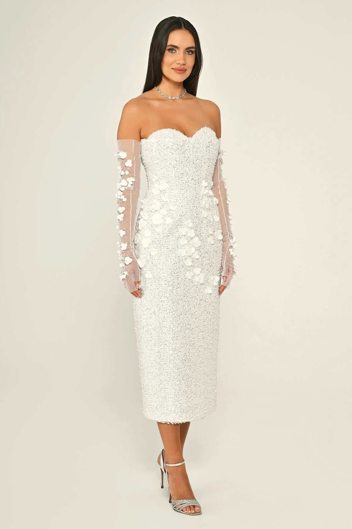 A gown in flowing tulle, embellished with sequins, with a natural waistline and a midi length — lightweight and elegant, perfect for evening soirees.