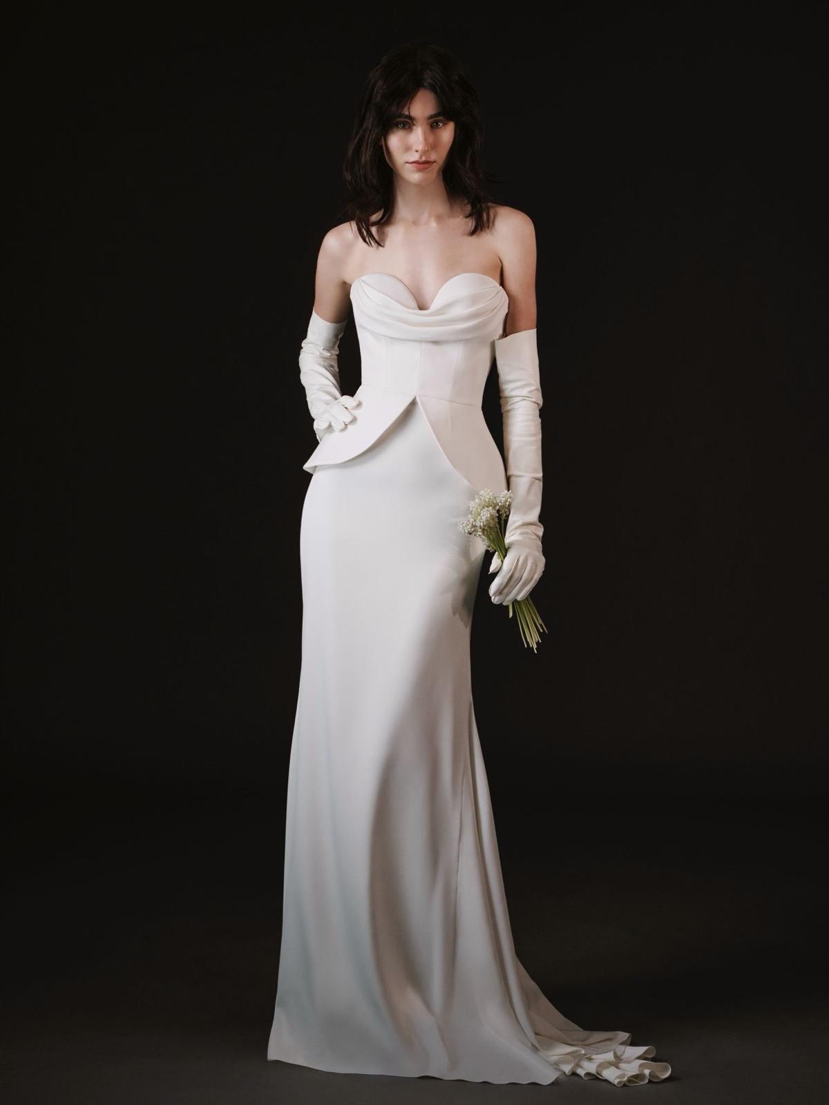 The Oakleigh gown by Vera Wang is a study in modern romance and timeless elegance. Crafted in fluid crepe and luminous charmeuse, this gown drapes the body with effortless grace, its silhouette gently tracing each curve. The off-shoulder neckline frames the collarbones and shoulders with soft allure, creating a look that feels both sophisticated and tenderly romantic. With its clean lines and understated beauty, Oakleigh speaks to the bride who longs for simplicity elevated into poetry—a gown where every detail whispers elegance rather than shouts.
