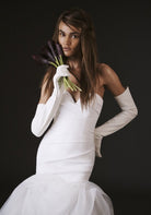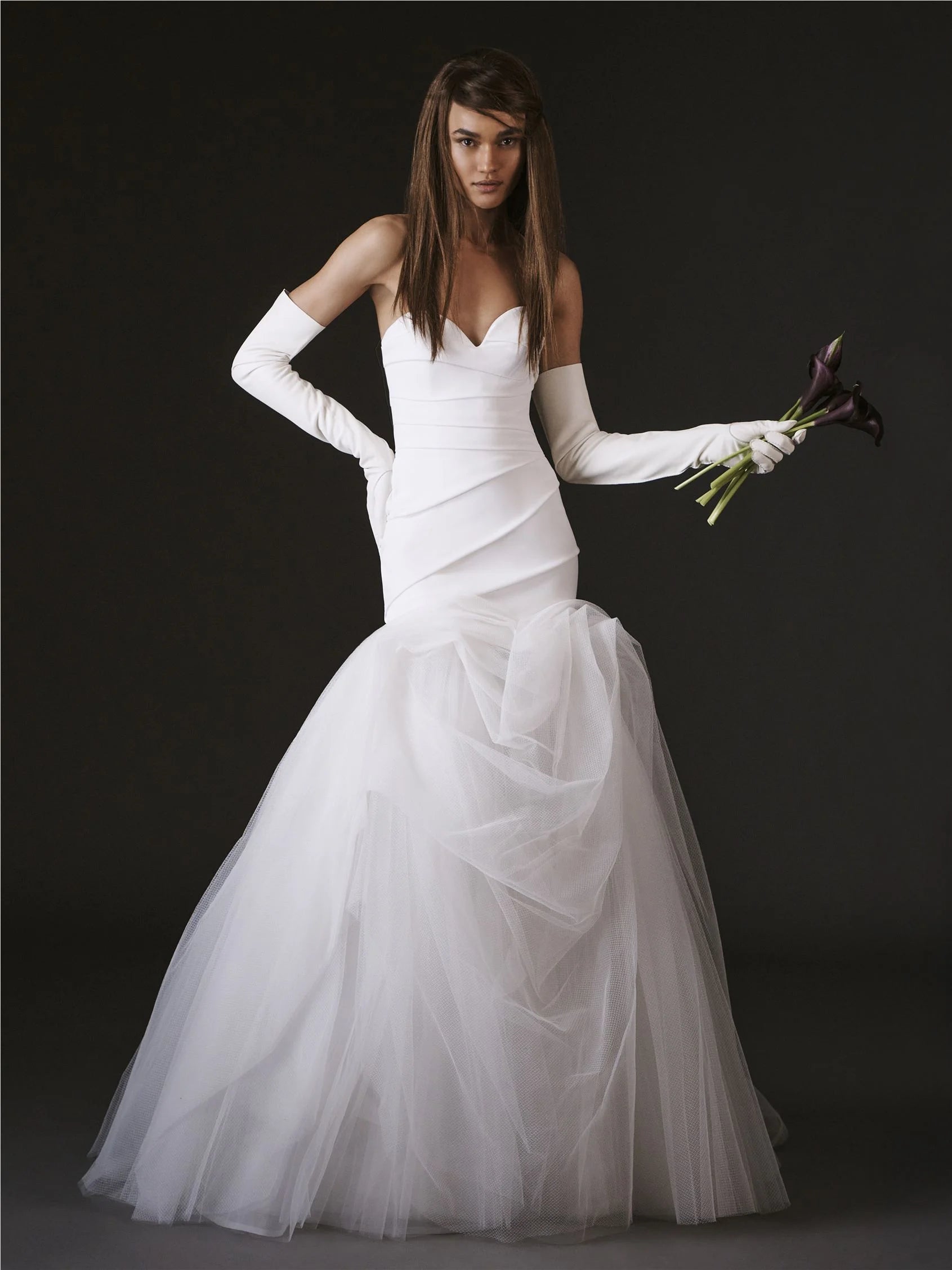 The romantic sweetheart neckline highlights your décolletage beautifully, while the open back adds a touch of sultry sophistication. Crafted with a sculpted crepe bodice and soft, artful draping, the gown flows seamlessly into a voluminous tulle skirt that moves like a dream.