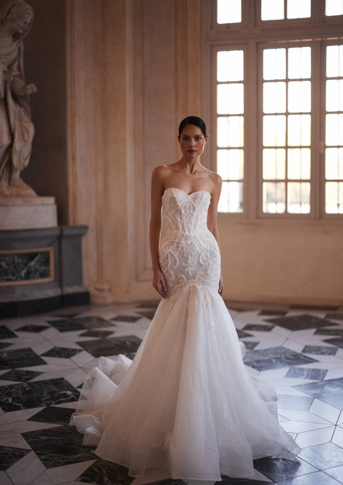 A gown in which every interlacing resonates like a line from an ancient legend. The patterns compose a story one longs to read with the eyes again and again, unveiling nobility and hidden beauty.