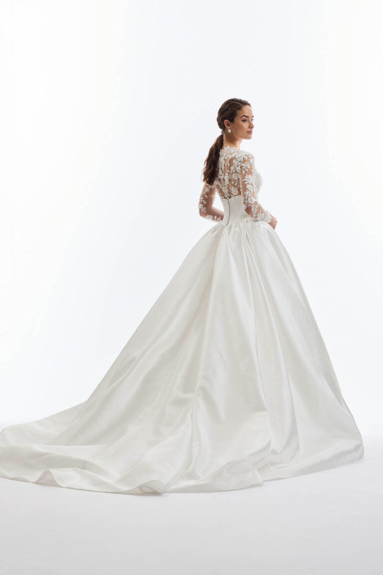 The AM67 gown from Demetrios' 2026 Alta Moda Collection is a bold and regal ball gown. It features a deep V-neck floral-lace bodice with long sleeves and a sculpted corset waist. The dress is crafted from luxurious fabrics such as dupione, satin, or mikado, and boasts a high-waisted silhouette with a structured skirt, making it a statement piece for the modern bride.